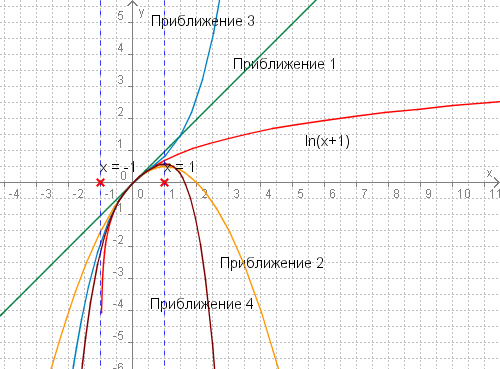![]() Пресметнатите по-този алгоритъм логаритми, в повечето случаи са ирационални числа Разлагане в ред на Тейлър ln(1 + x) = x - x2/2 + x3/3 - xn/n + ... , където n = 1, 2, 3, ... Това е ралагането на ln() в ред на Тейлър, около точката x = 1. Този ред е верен, само когато |x| < 1, т.е. с този ред могат да се смятат само логаритми в интервала (0, 2). На фиг. 2 можете да видите първите 4 приближения на този ред, т.е. ƒn(x) за Фиг. 2