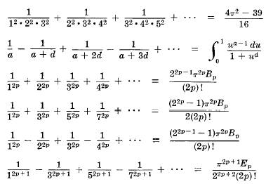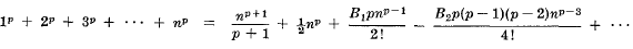 където редицата свършва с n2 или n според това дали р е четно или нечетно, и Bk са числата на Бернули.