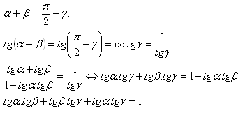 Задача 2: Докажете, че ако $\alpha + \beta + \gamma = \frac{\pi}{2}$, то