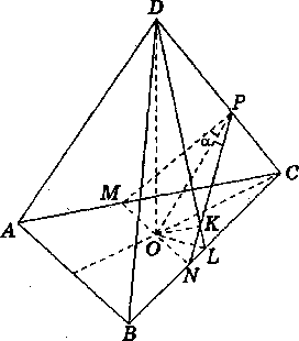 (DOK), то DK∩BC = L, където L е средата на BC(черт. 1). Тогава от ΔDOL имаме, че 2SDOL = h.OL = p.DL = p.√h2 + OL2, откъдето h = (p.OL)/√OL2 - p2. Но OL = (a.√3)/6 = (p√3) /2cosα. Следователно h = (p√3)/(√3 - 4cos2α и V = 9p3/(4cos2α√3 - 4cos2α). Задачата има смисъл ако 3 - 4cos2α > 0(т.е. OL > p), което е изпълнено за α
