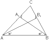 Задача 14. На чертежа АA1 и BB1 са височини в триъгълник ABC. Ако ABB1 = 40° и BAA1=30° , то мярката на ACB е: