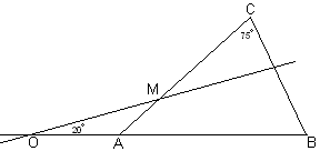 Задача 15. На чертежа $OA = AM, \angle AOM=20^{\circ}, \angle ACB=75^{\circ}$. Мярката на ъгъл ABC е: